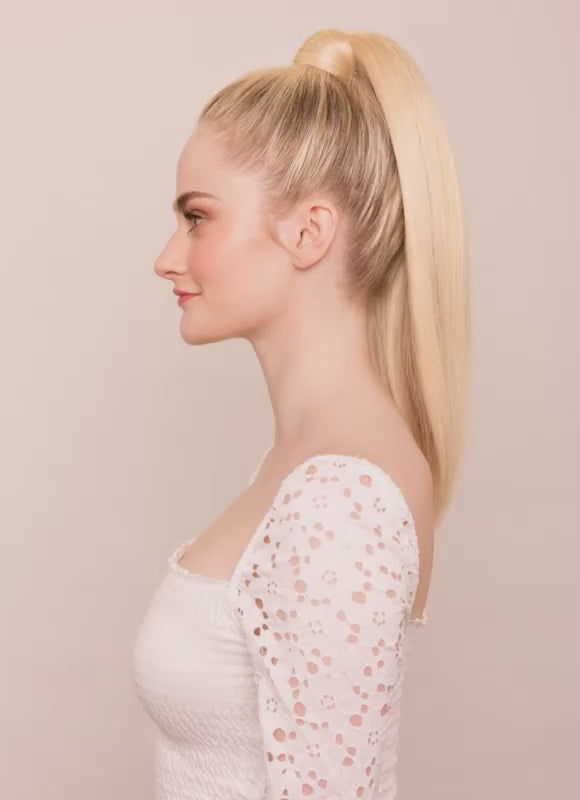 Get the perfect ponytail in seconds with our 16 Inch Clip-In Ponytail Extension in #60 Light Blonde. Crafted from double drawn, cuticle-aligned 100% Remy human hair, this premium clip-in piece adds instant length, volume, and sleek style to your natural ponytail — without the need for teasing or damage.