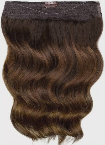 Achieve fuller, thicker hair in seconds with our 16 inch Halo Hair Extensions in Mocha & Medium Brown Balayage. Crafted from 100% Remy human hair, this innovative one-piece extension offers a comfortable, lightweight, and temporary alternative to traditional methods like clips, glues, beads, and weaves.