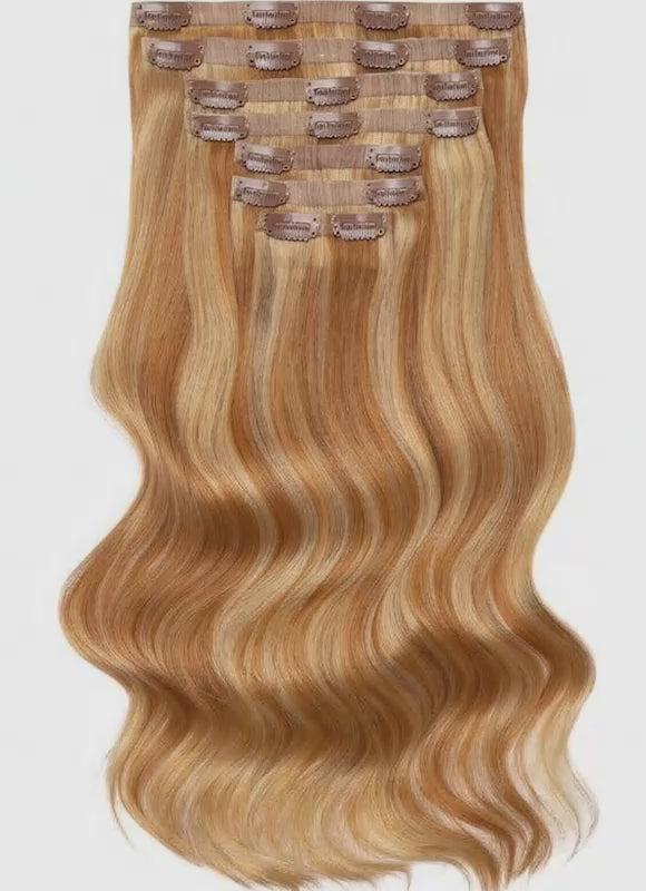 Our 20” Seamless Clip-In Hair Extensions in Light Brown with Light Blonde Highlights blend effortlessly for a flawless finish. Crafted with ultra-lightweight, invisible wefts, they lie flat against the scalp for a discreet and comfortable fit. Made from the highest grade 100% genuine Remy human hair, these extensions deliver silky softness, natural movement, and long-lasting wear. Each weft features premium metal clips lined with silicone for a secure, gentle hold that stays in place all day.