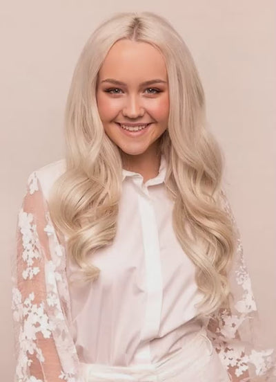 Indulge in the thickest, most luxurious hair extensions we offer — our 20 inch Ultimate Volume Clip-In Hair Extensions in Platinum Blonde. Crafted from double drawn, 100% cuticle-aligned Remy human hair, these premium extensions deliver exceptional thickness from top to ends, a soft, silky feel, and stunning, natural-looking volume.