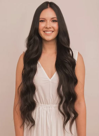 Experience unparalleled length and volume with our 30 inch Ultimate Volume Clip-In Hair Extensions in Natural Black. Crafted from the highest grade 100% Remy human hair, these extensions are double drawn and cuticle-aligned, ensuring thickness from root to tip and a silky, tangle-free finish.