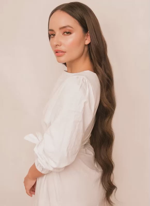 Experience unparalleled length and volume with our 30 inch Ultimate Volume Clip-In Hair Extensions in Mocha Brown. Crafted from the highest grade 100% Remy human hair, these extensions are double drawn and cuticle-aligned, ensuring thickness from root to tip and a silky, tangle-free finish.